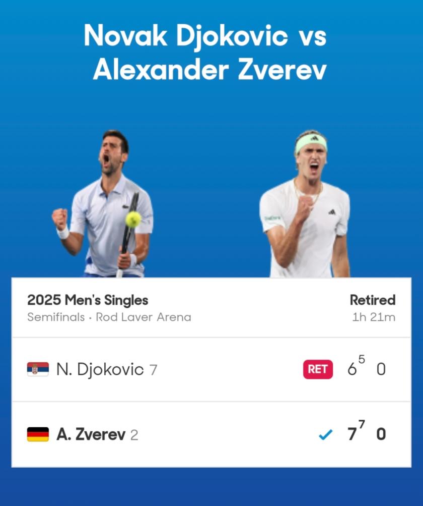 首盘比赛,德约与兹维列夫战至“抢七”,后者以7比6(5)拿下第一盘。而德约在第一盘结束后选择退赛。这盘比赛耗时81分钟。