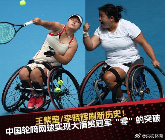 澳网轮椅网球女双决赛,中国组合王紫莹/李晓辉以2-0(6-2/6-3)击败中日跨国组合朱珍珍/田中爱美,为中国夺得历史上第一个轮椅网球大满贯冠军!